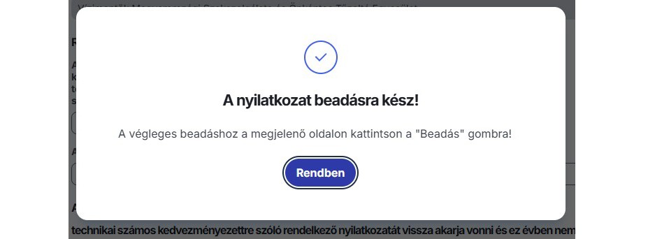 Ezután megjelenik a "A nyilatkozat beadásra kész!" felirat, kattintson a „Rendben” gombra.